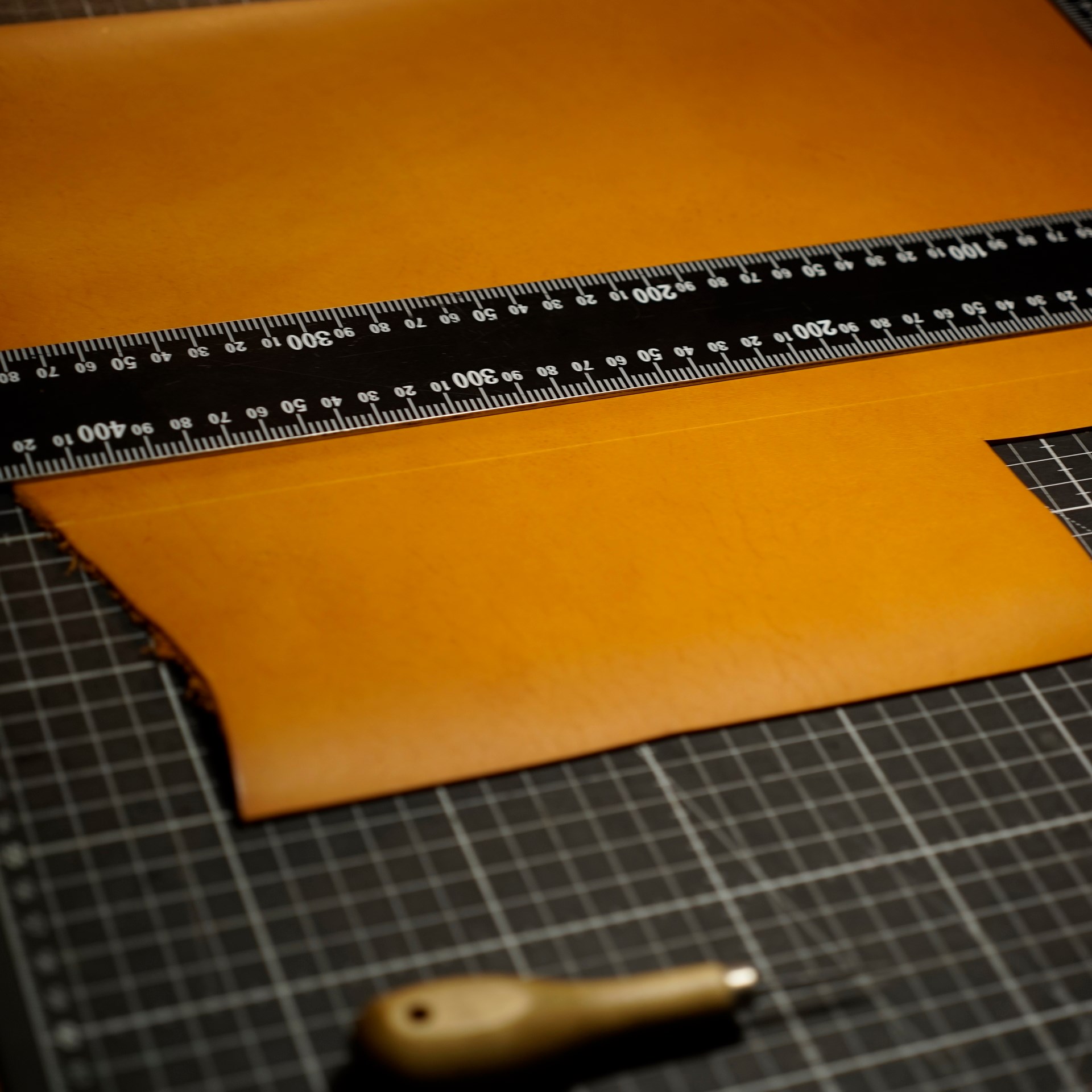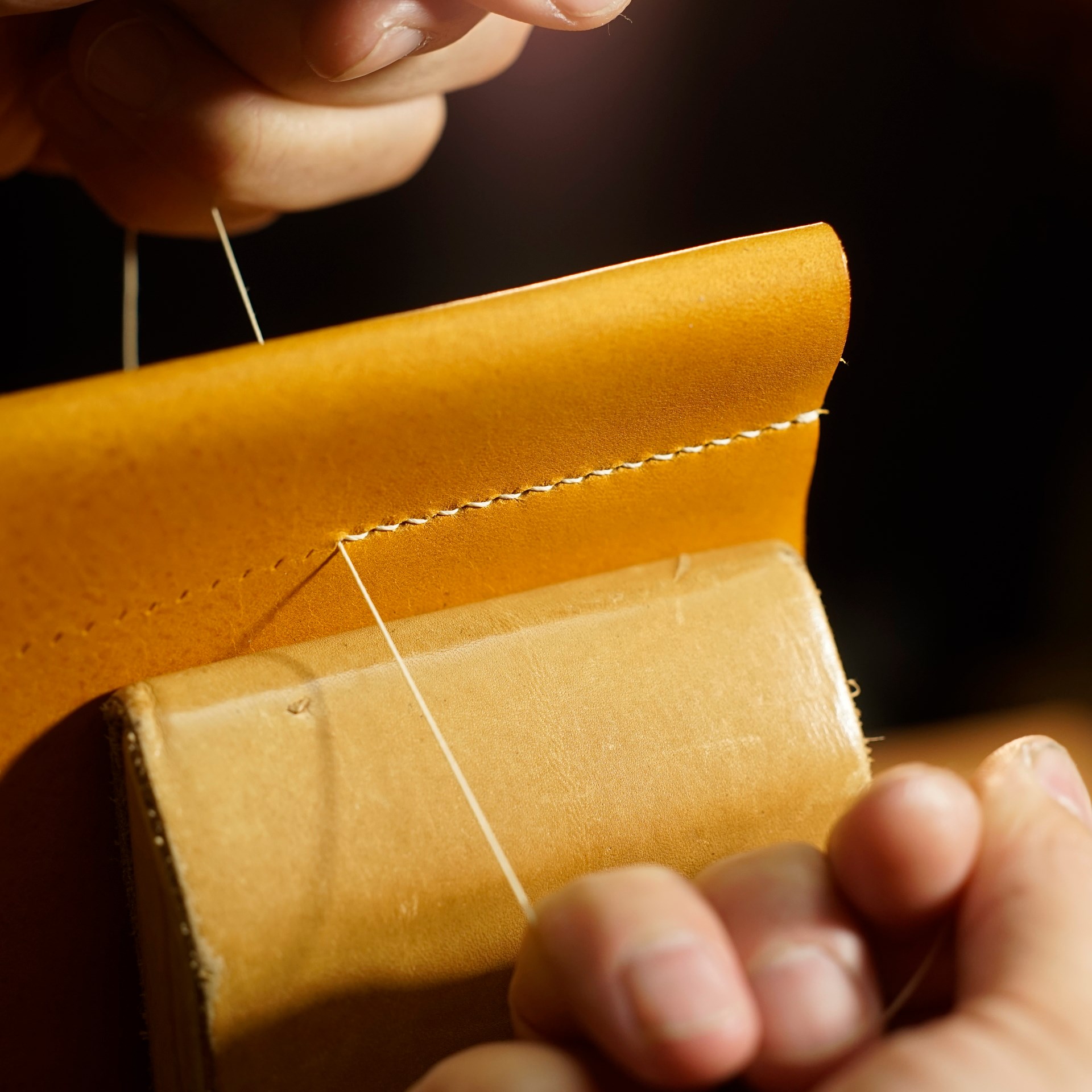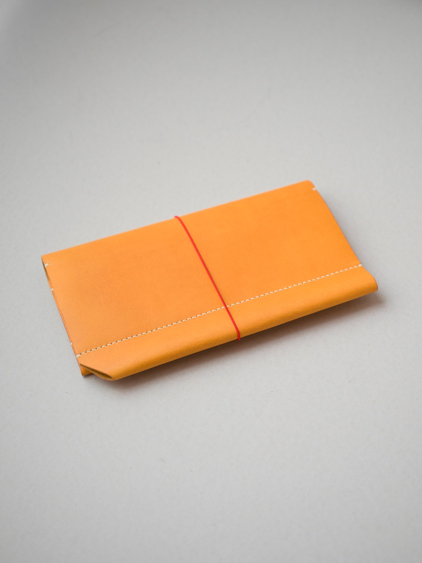 今回はイタリアンソフトのナポリで制作します。革をカットして目打ちとロゴを刻印します。六花リネン糸の06白米の糸で手縫いします。