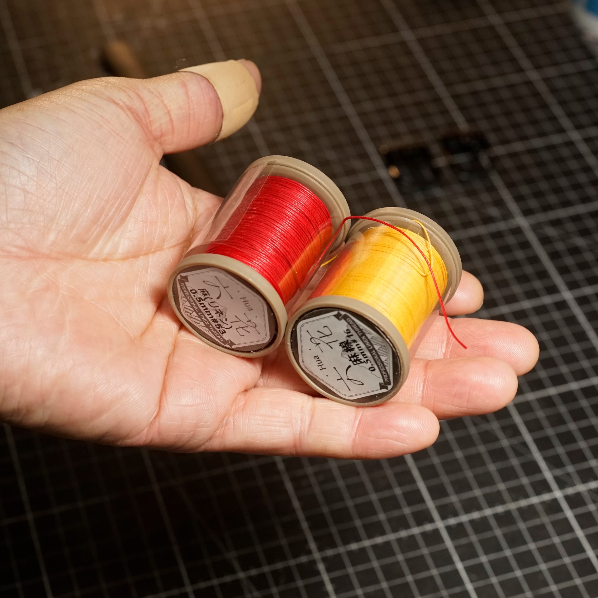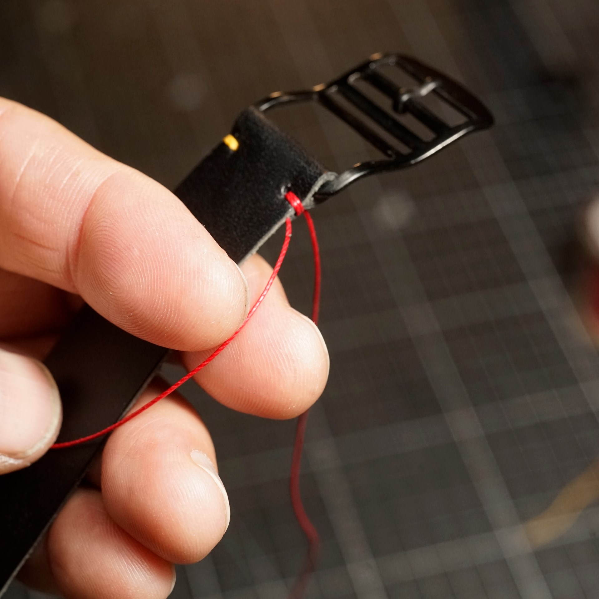 切出したイタリアンハードの黒のベルトに六花リネン糸の16山吹と53金赤を使用して縫い付けます。