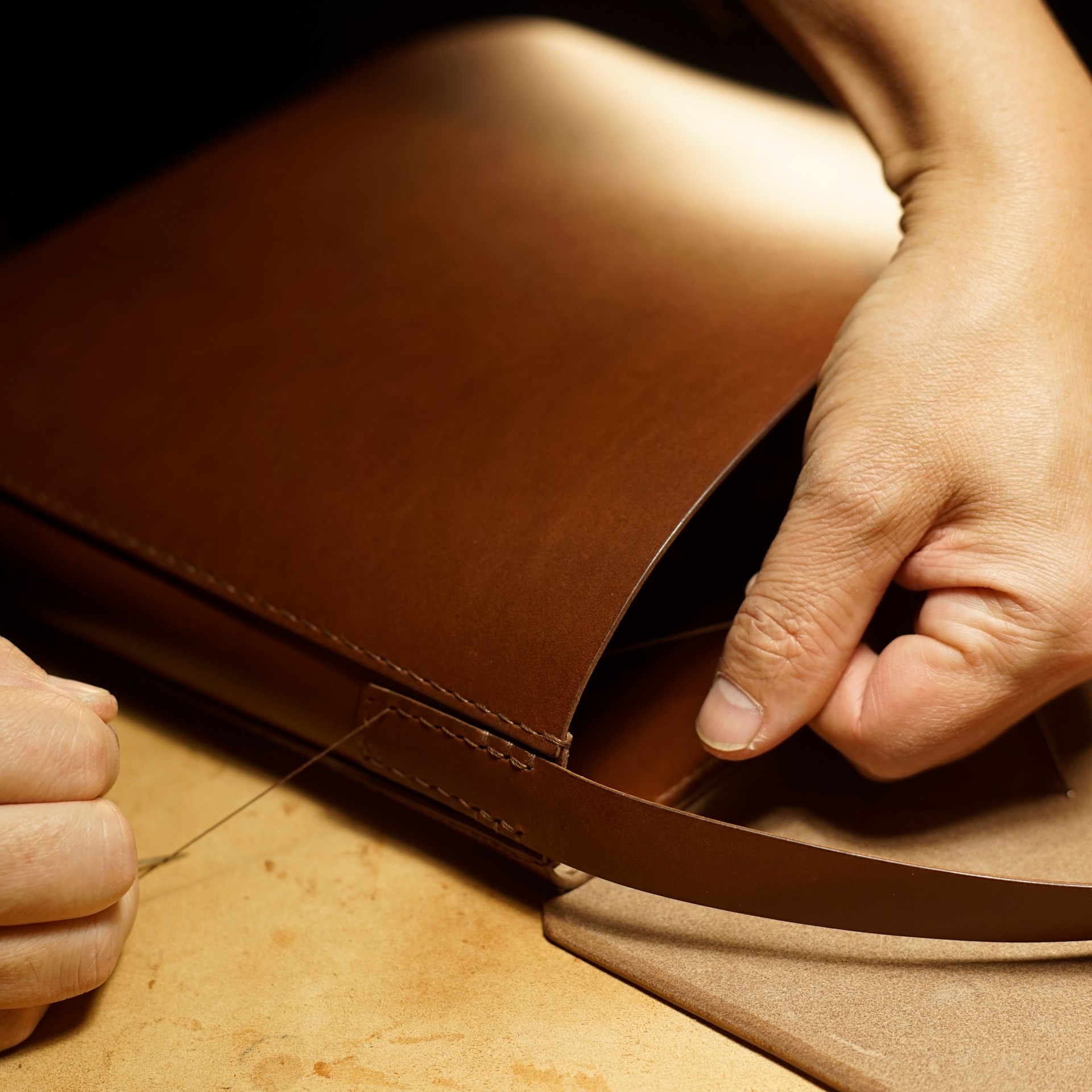 カバン本体にベルトを手縫いします。