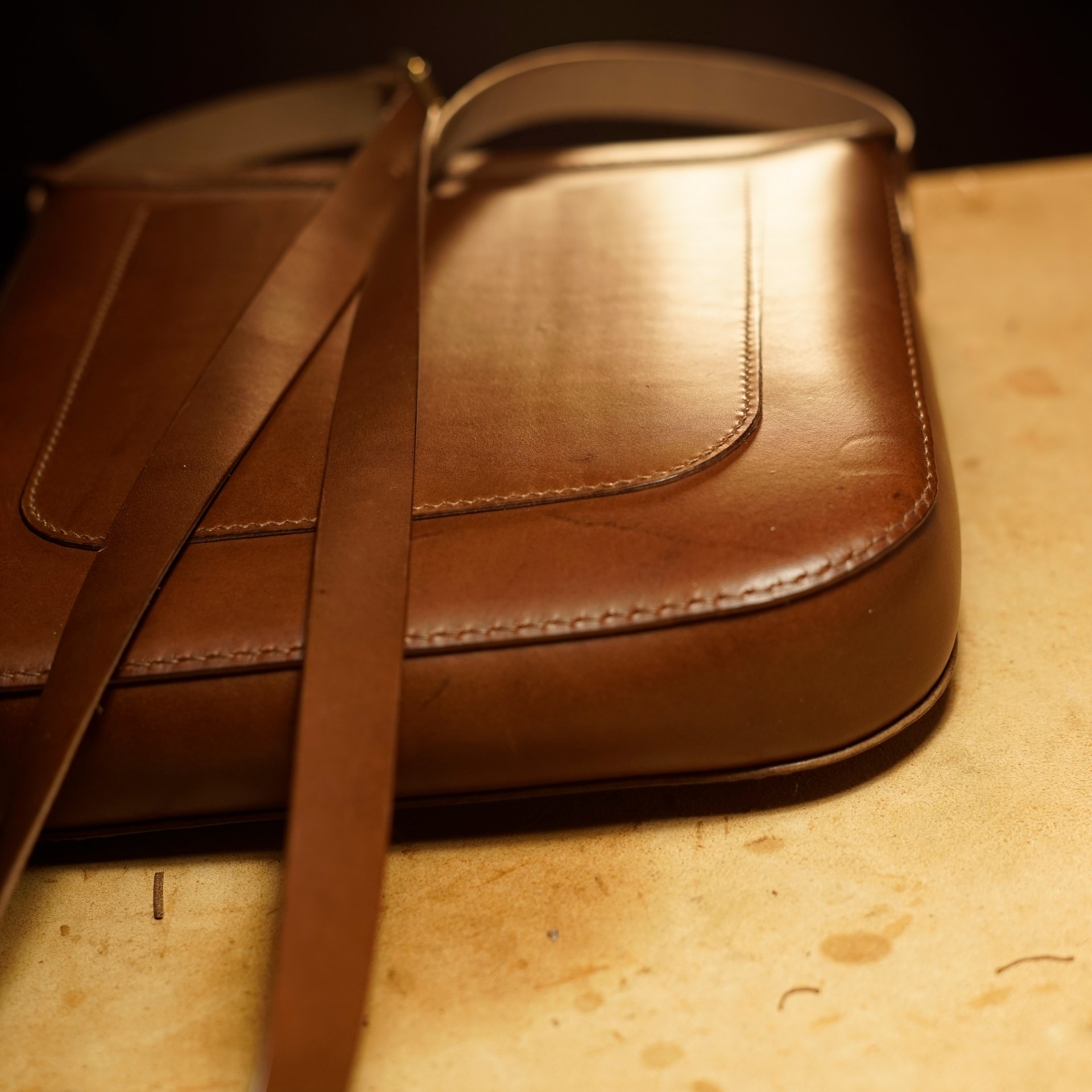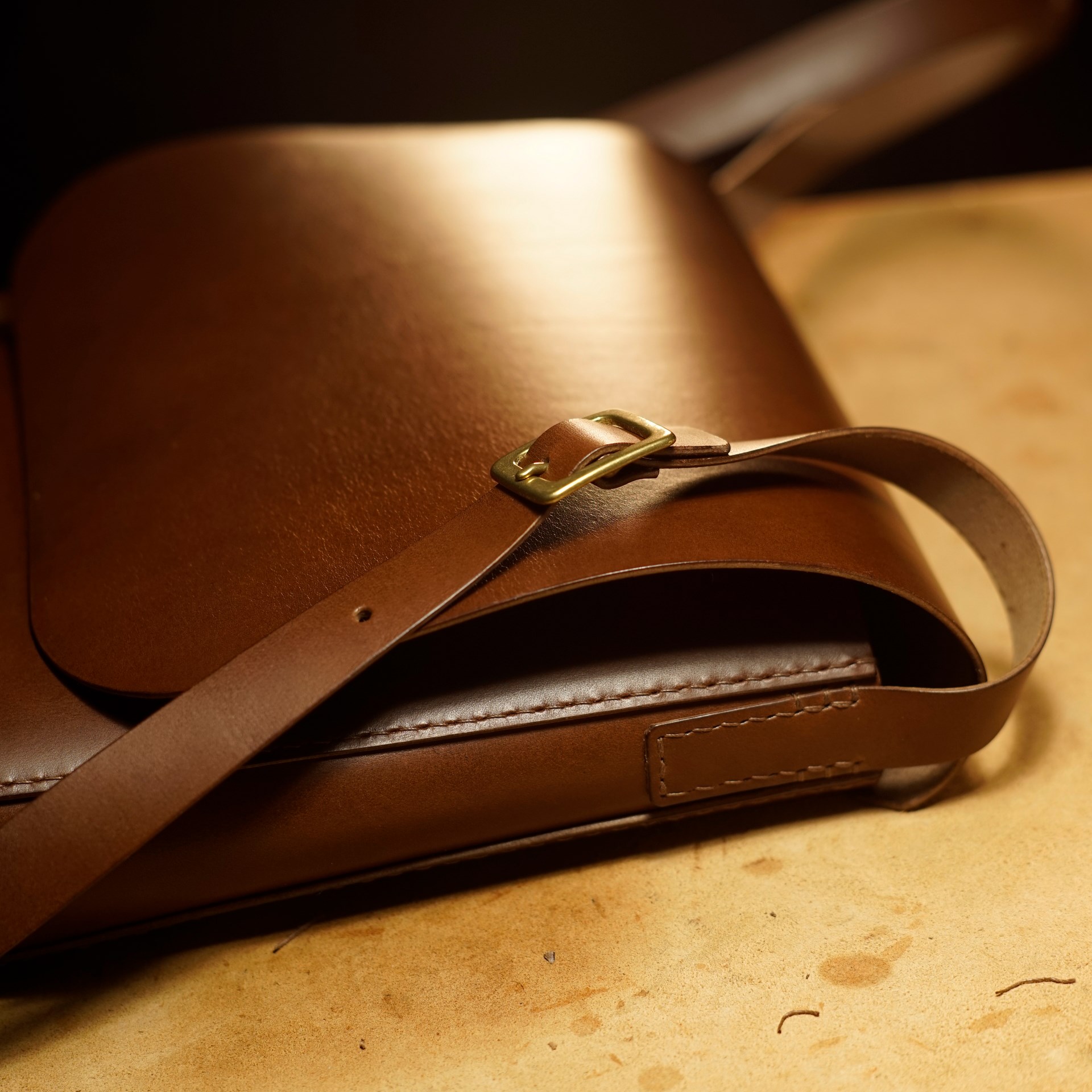 今回は革の種類を変えてイタリアンハードで制作しました。ソフトに比べてコシがありますので、かぶせ蓋に若干巻き癖がついていますが、使い込むほどに革が馴染んでいくと思います。