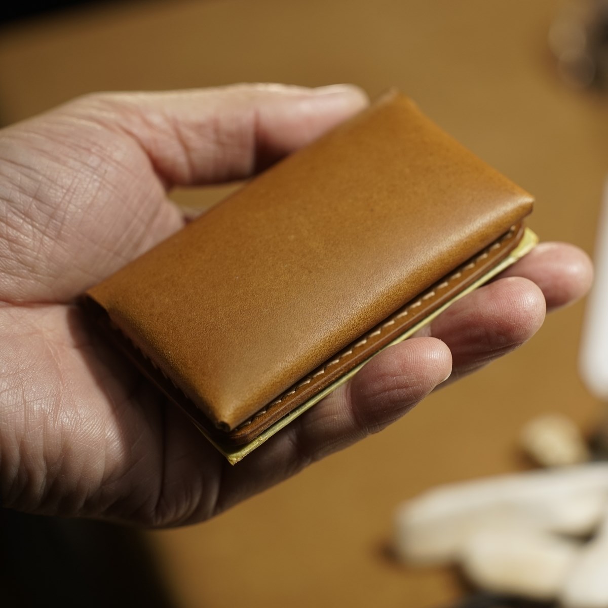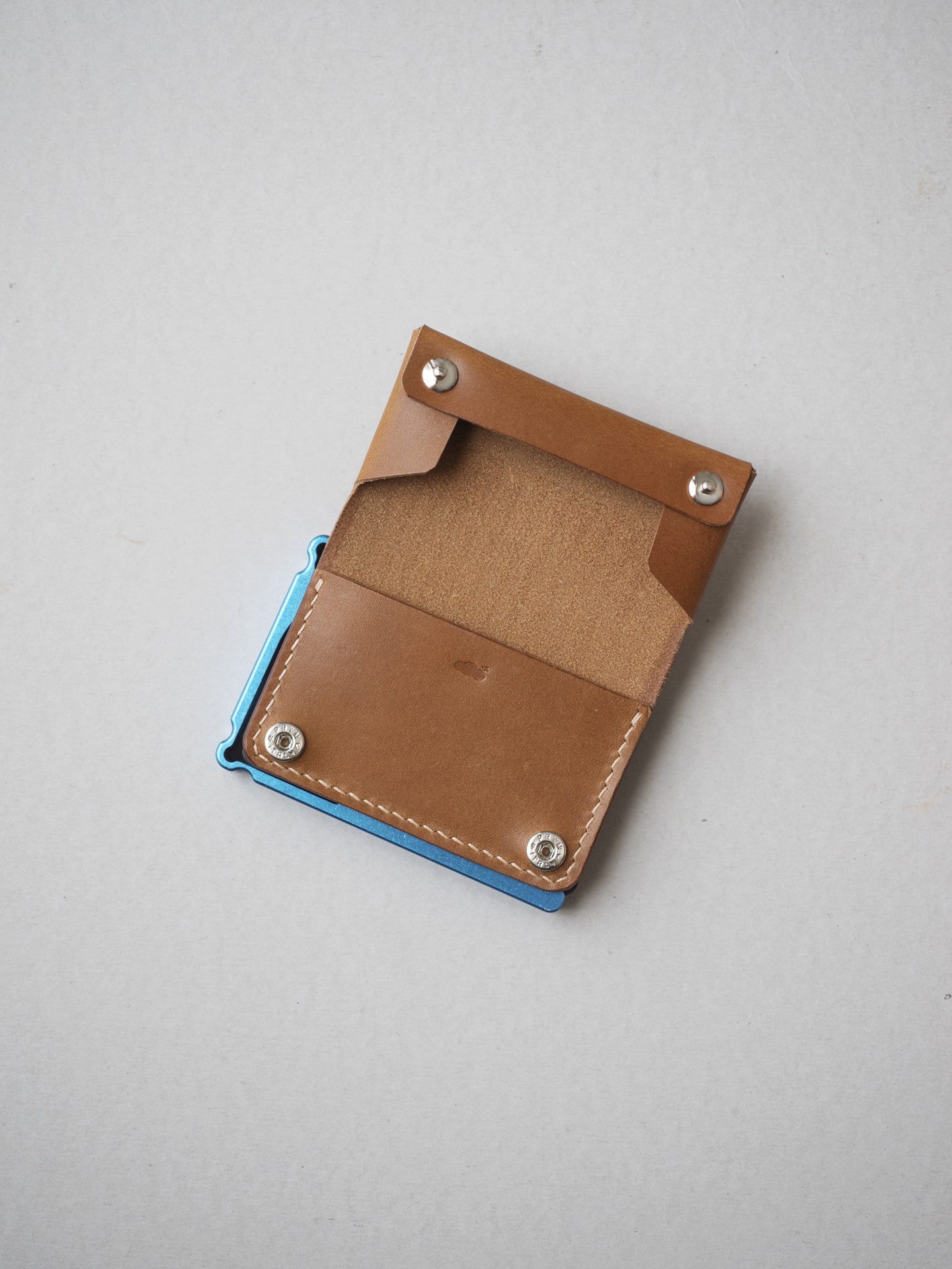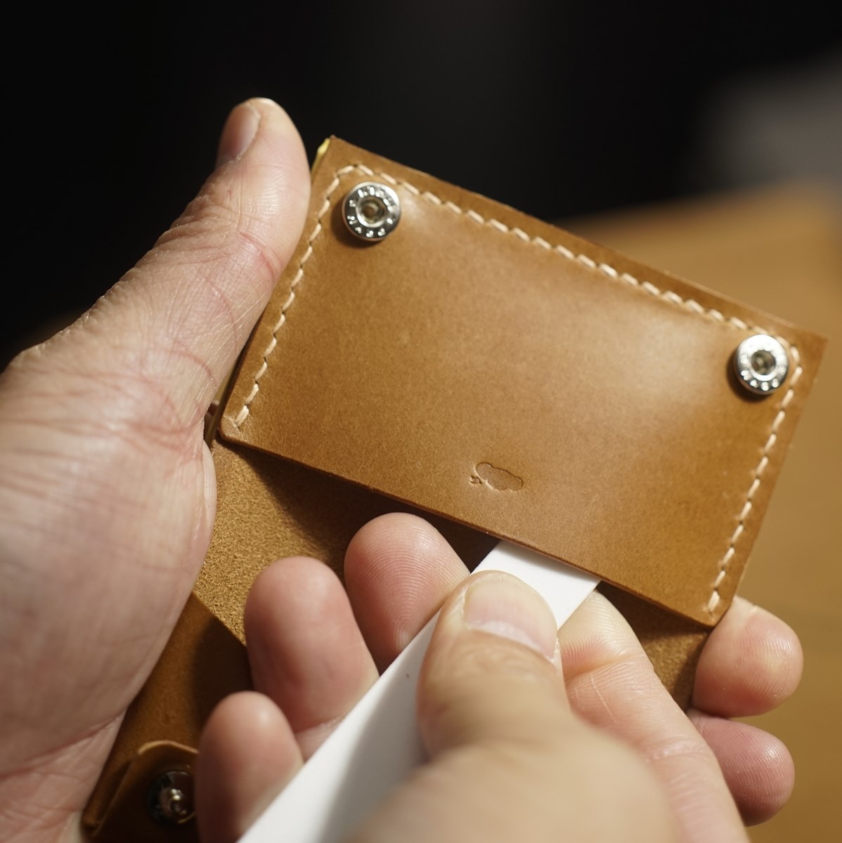 今回はイタリアンハード革のキャメルを使用したミニマリスト財布1型プラスの制作となります。手縫いで使用するのは六花リネン糸の05薄茶です。ホックは定番プリムの挽物ホック。カチッとした感触が気持ち良いホックです。
