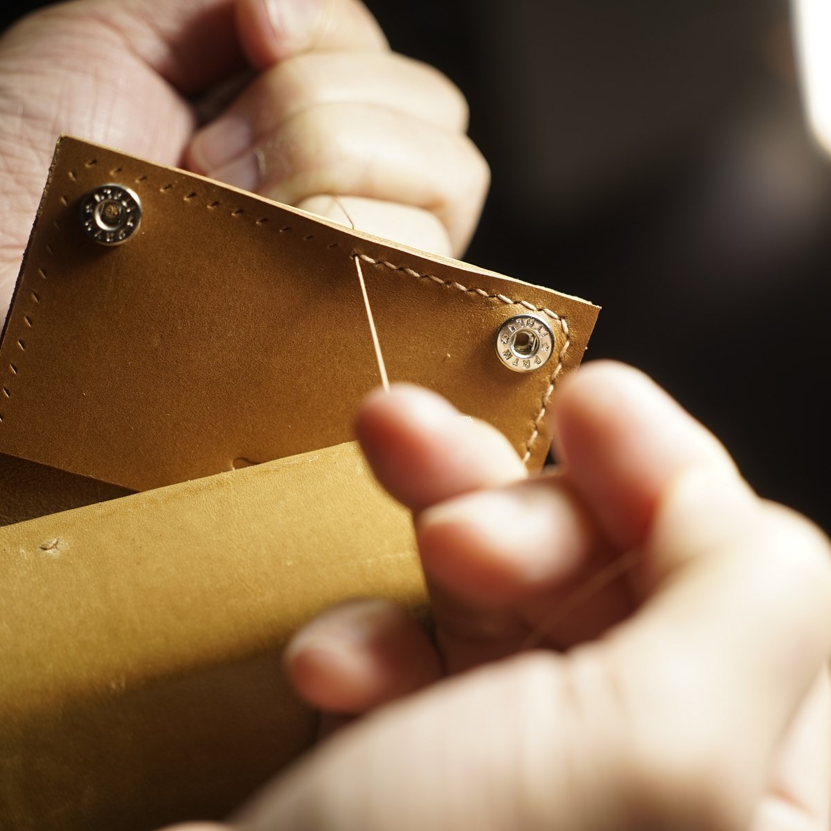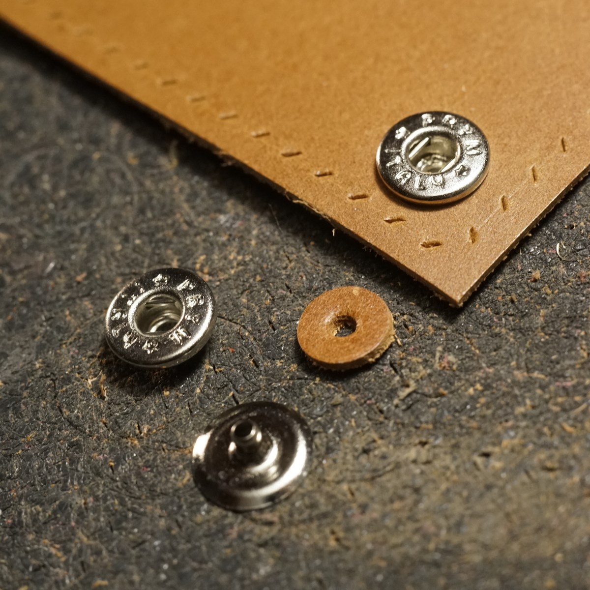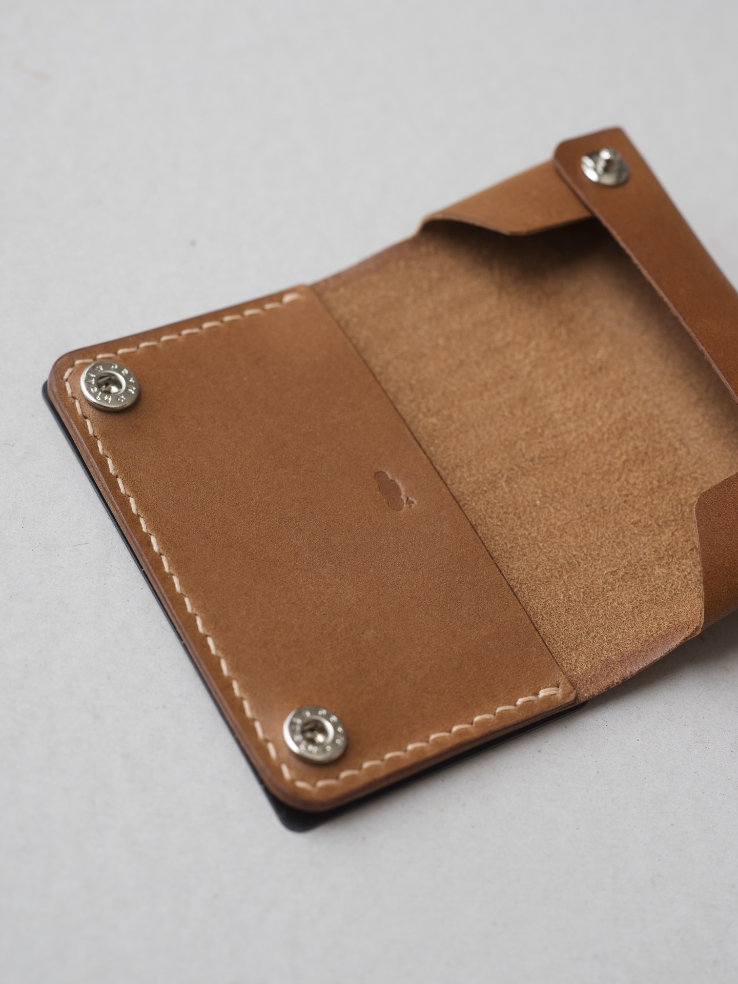 今回はイタリアンハード革のキャメルを使用したミニマリスト財布1型プラスの制作となります。手縫いで使用するのは六花リネン糸の05薄茶です。ホックは定番プリムの挽物ホック。カチッとした感触が気持ち良いホックです。