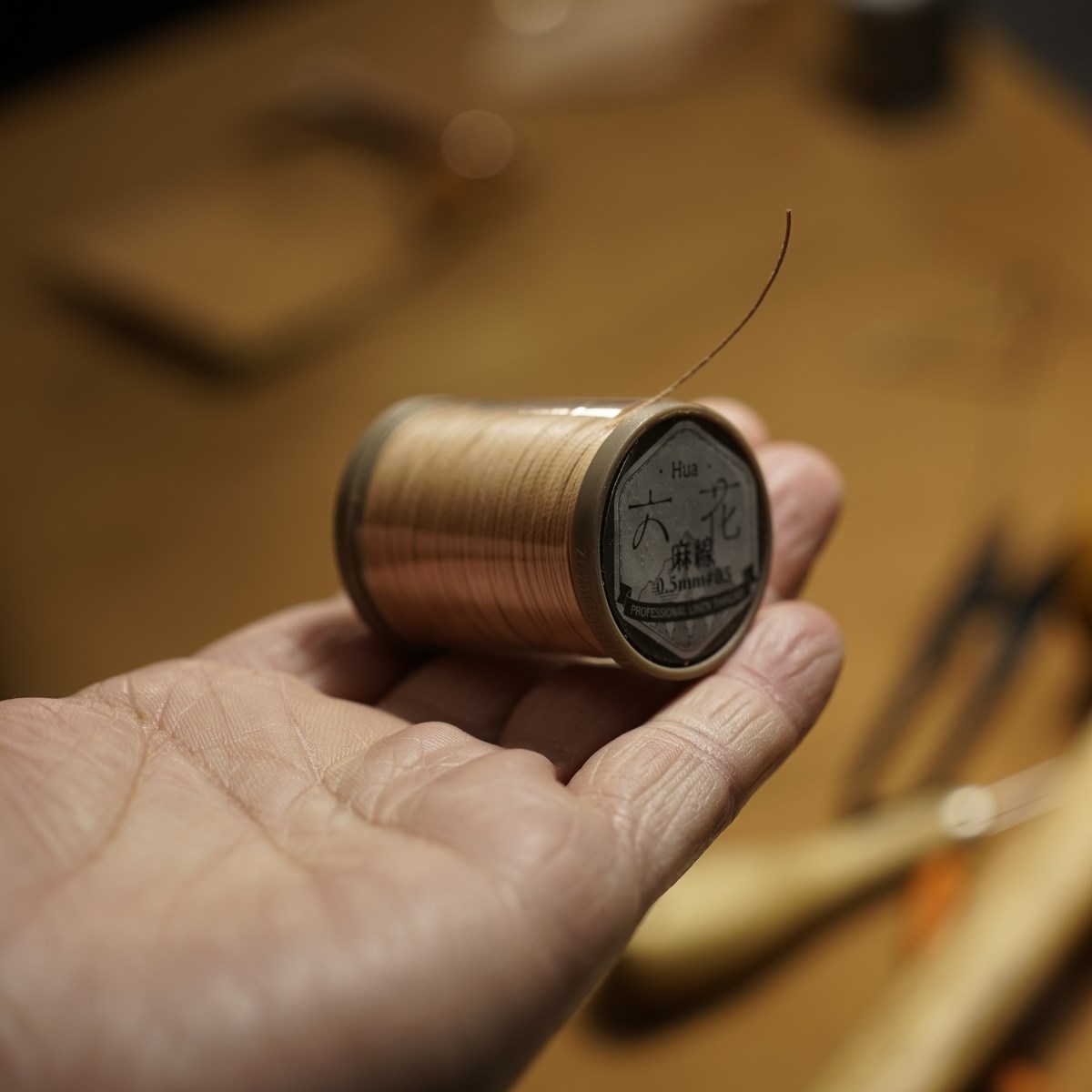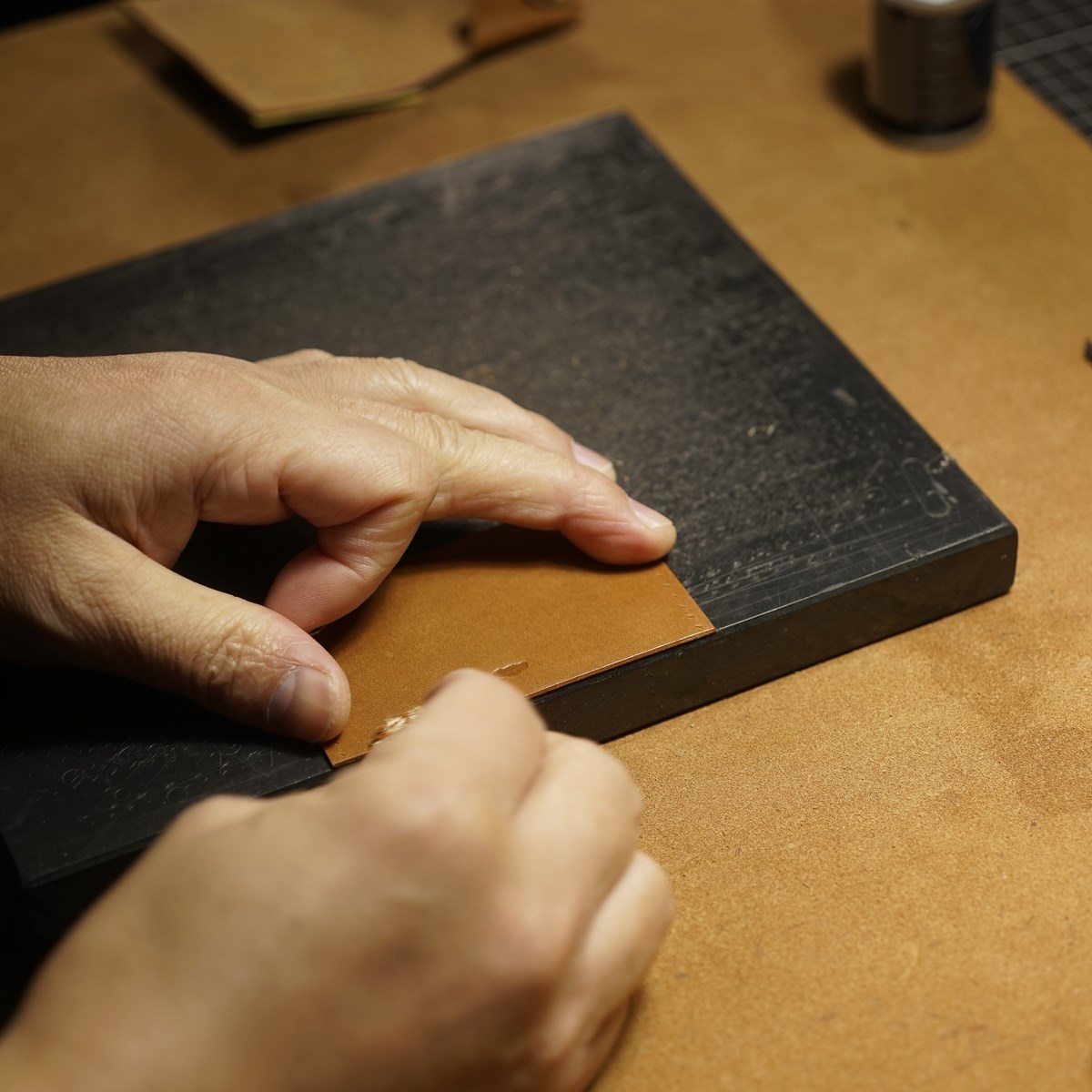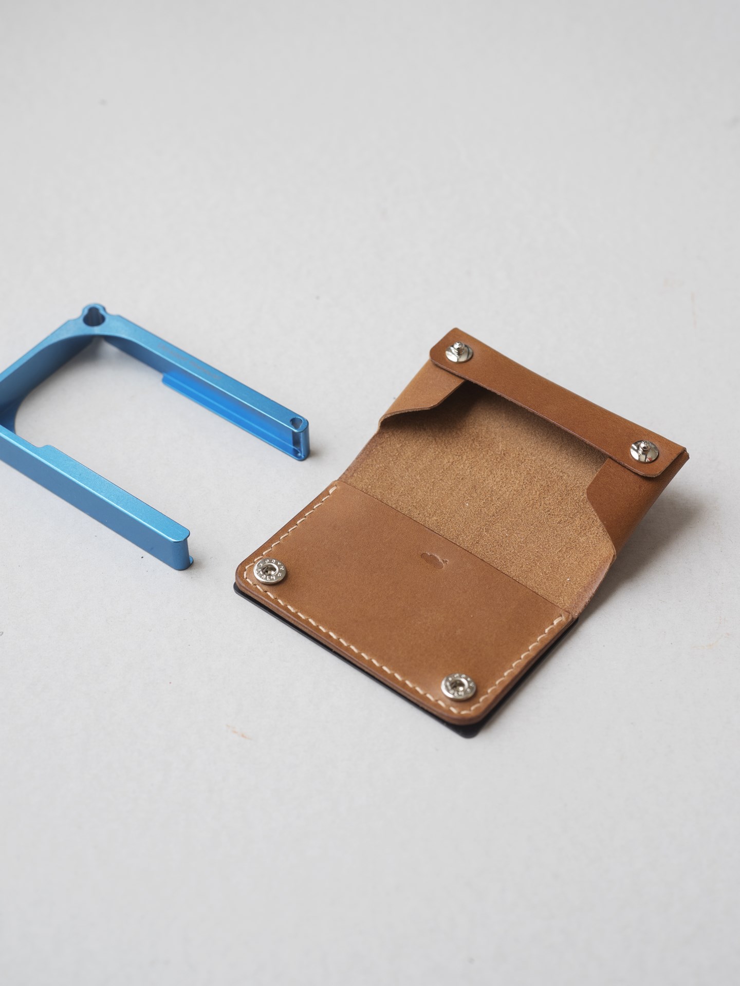 今回はイタリアンハード革のキャメルを使用したミニマリスト財布1型プラスの制作となります。手縫いで使用するのは六花リネン糸の05薄茶です。ホックは定番プリムの挽物ホック。カチッとした感触が気持ち良いホックです。