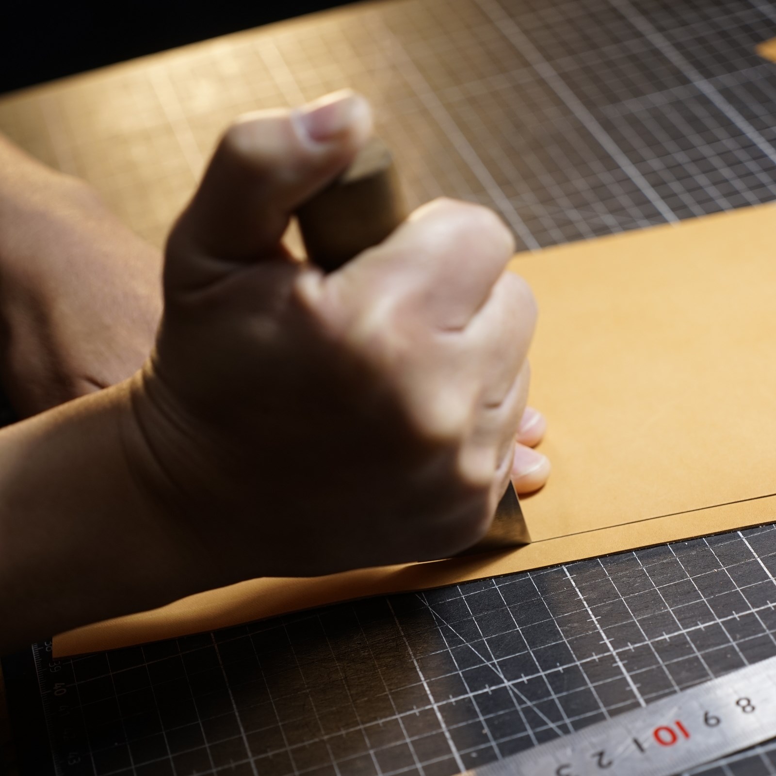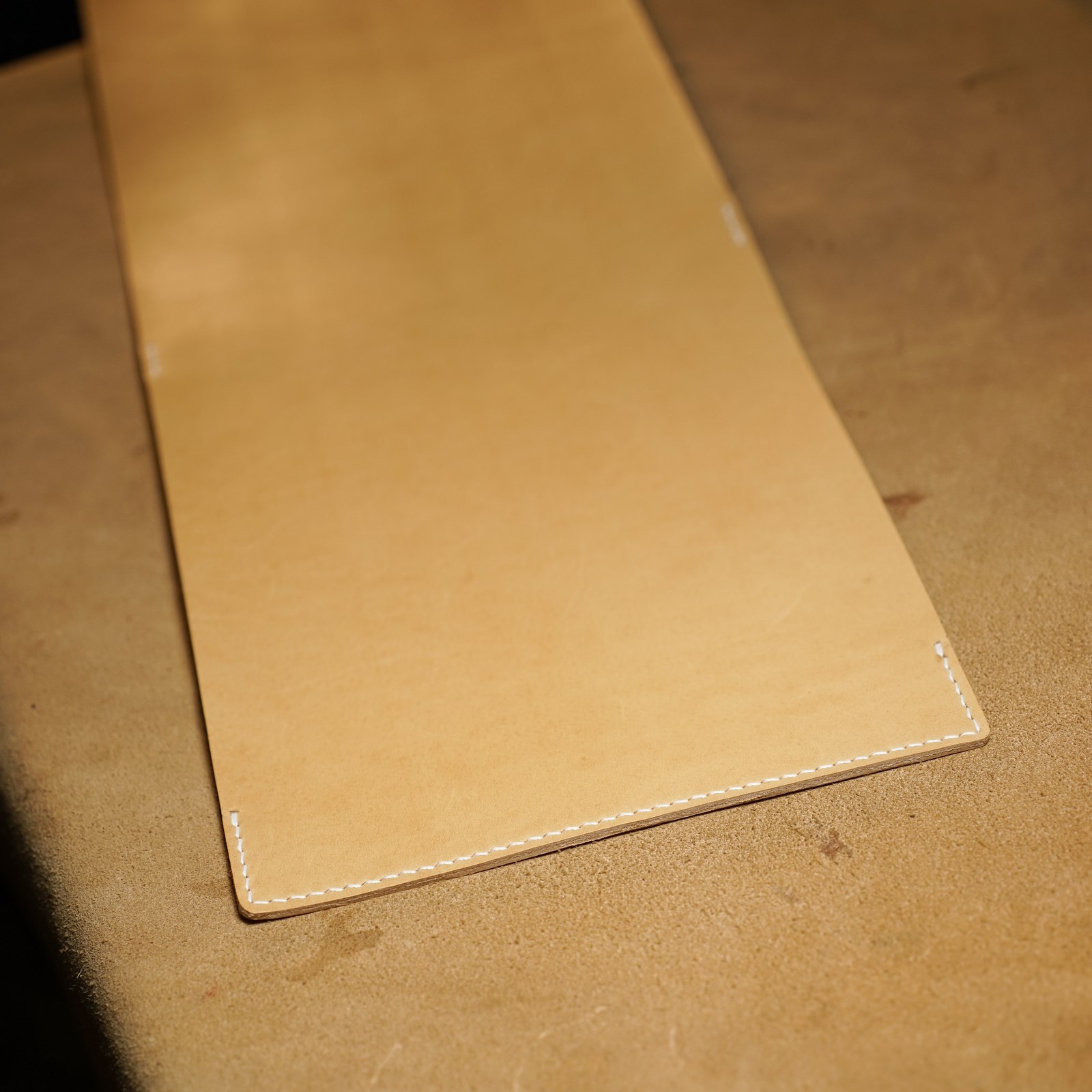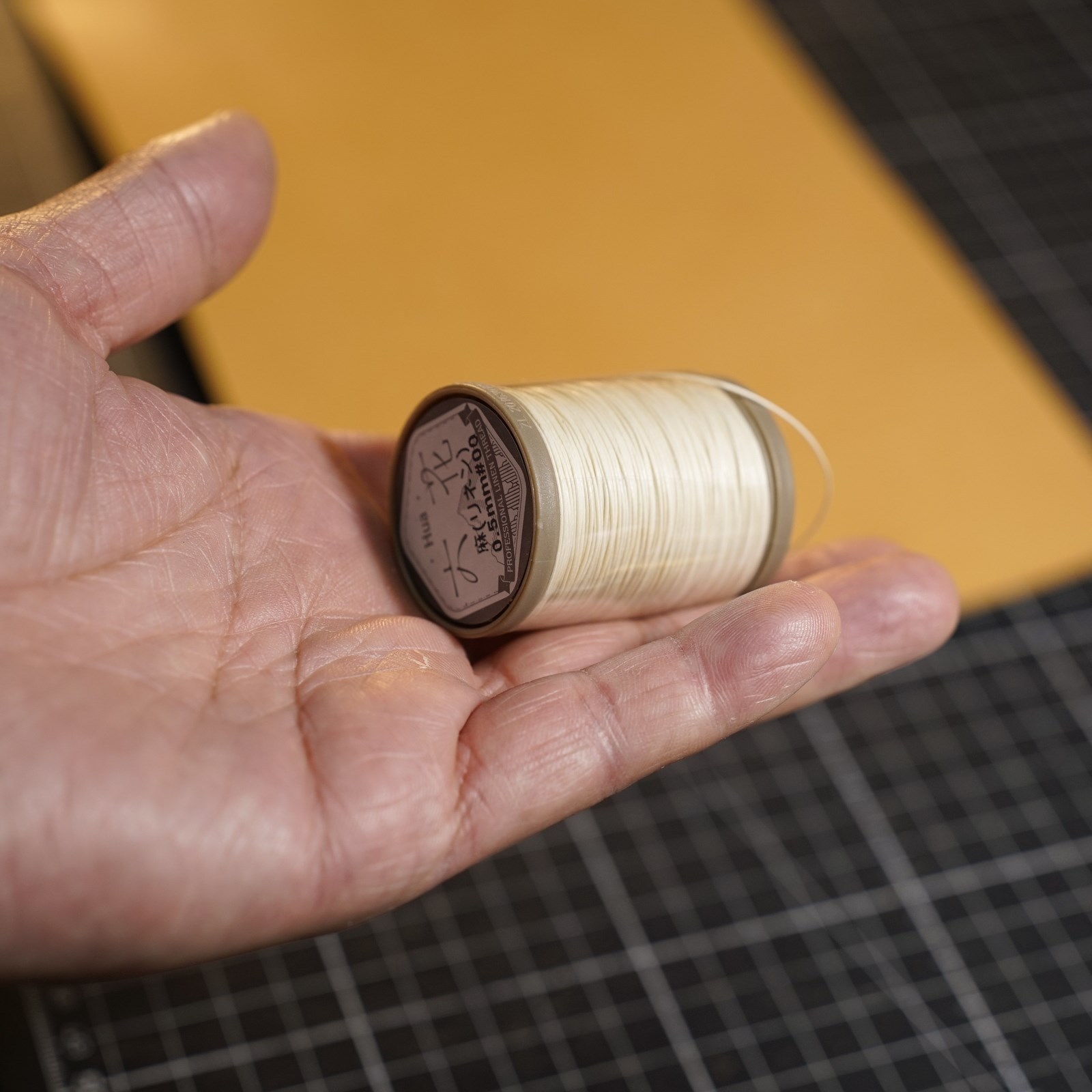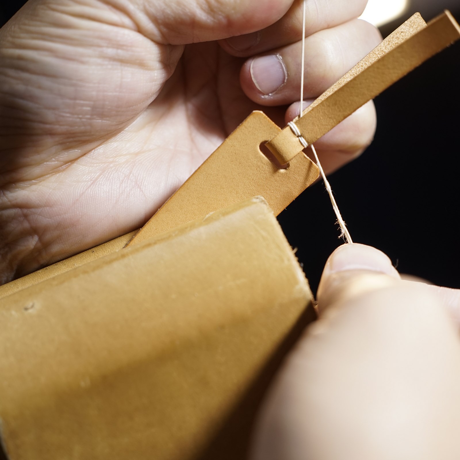 イタリアンソフトの生成りをカットして刻印を入れたら、六花リネン糸の00生成りで手縫いします。