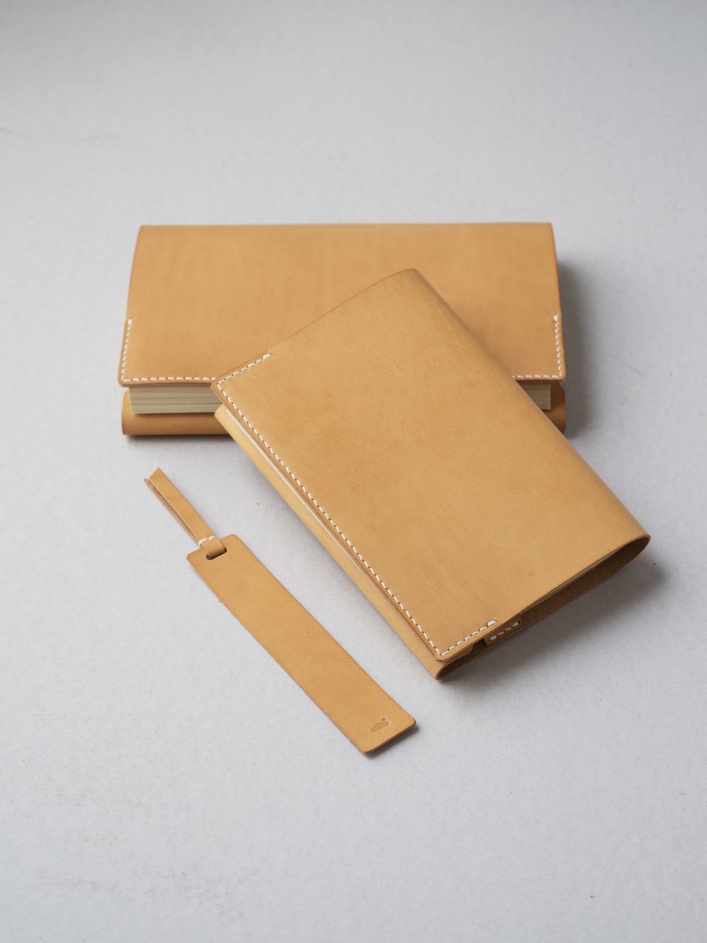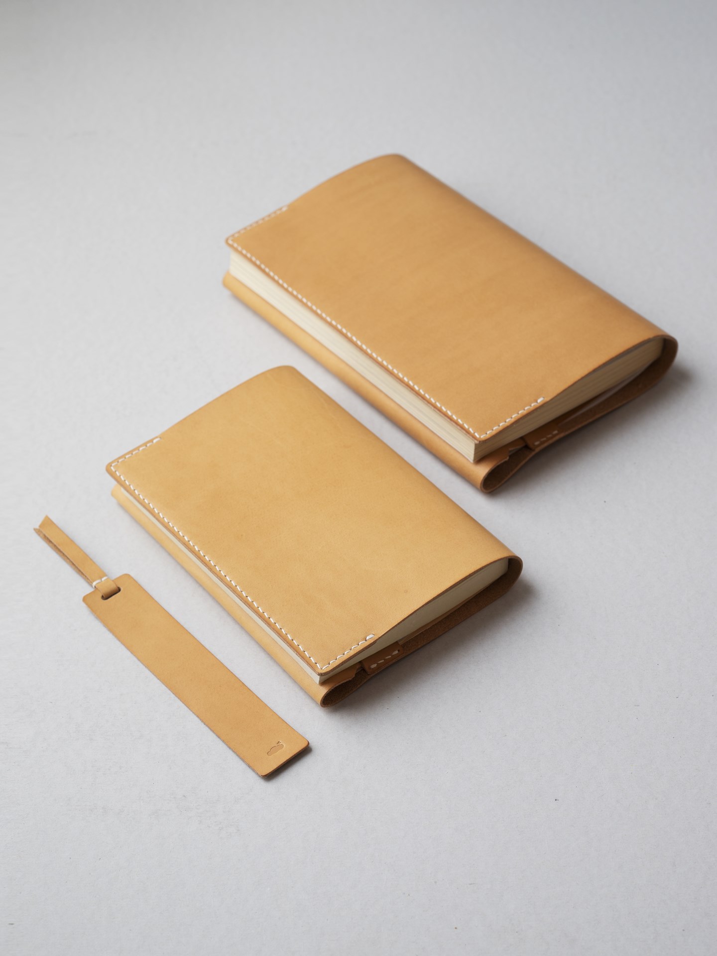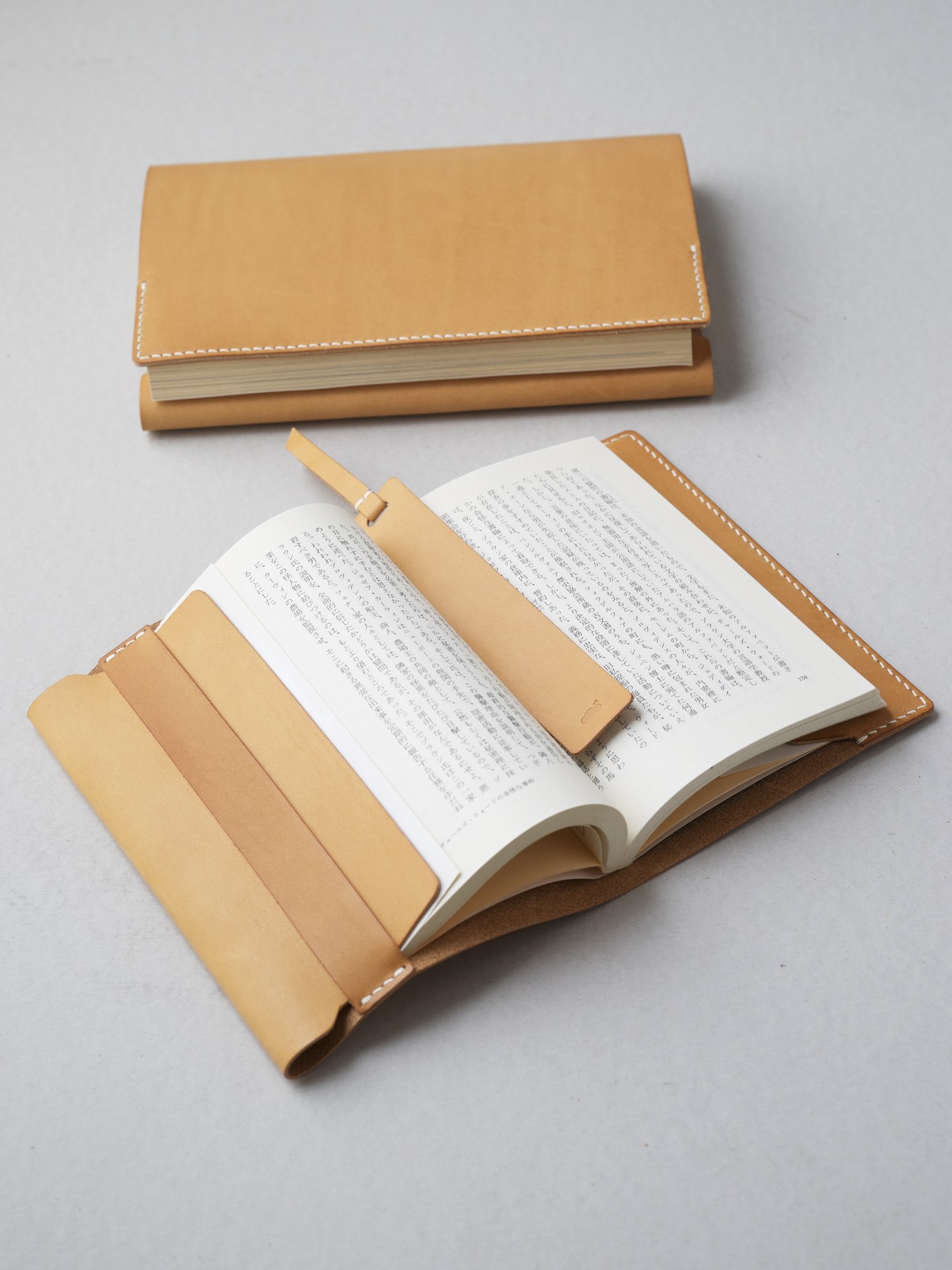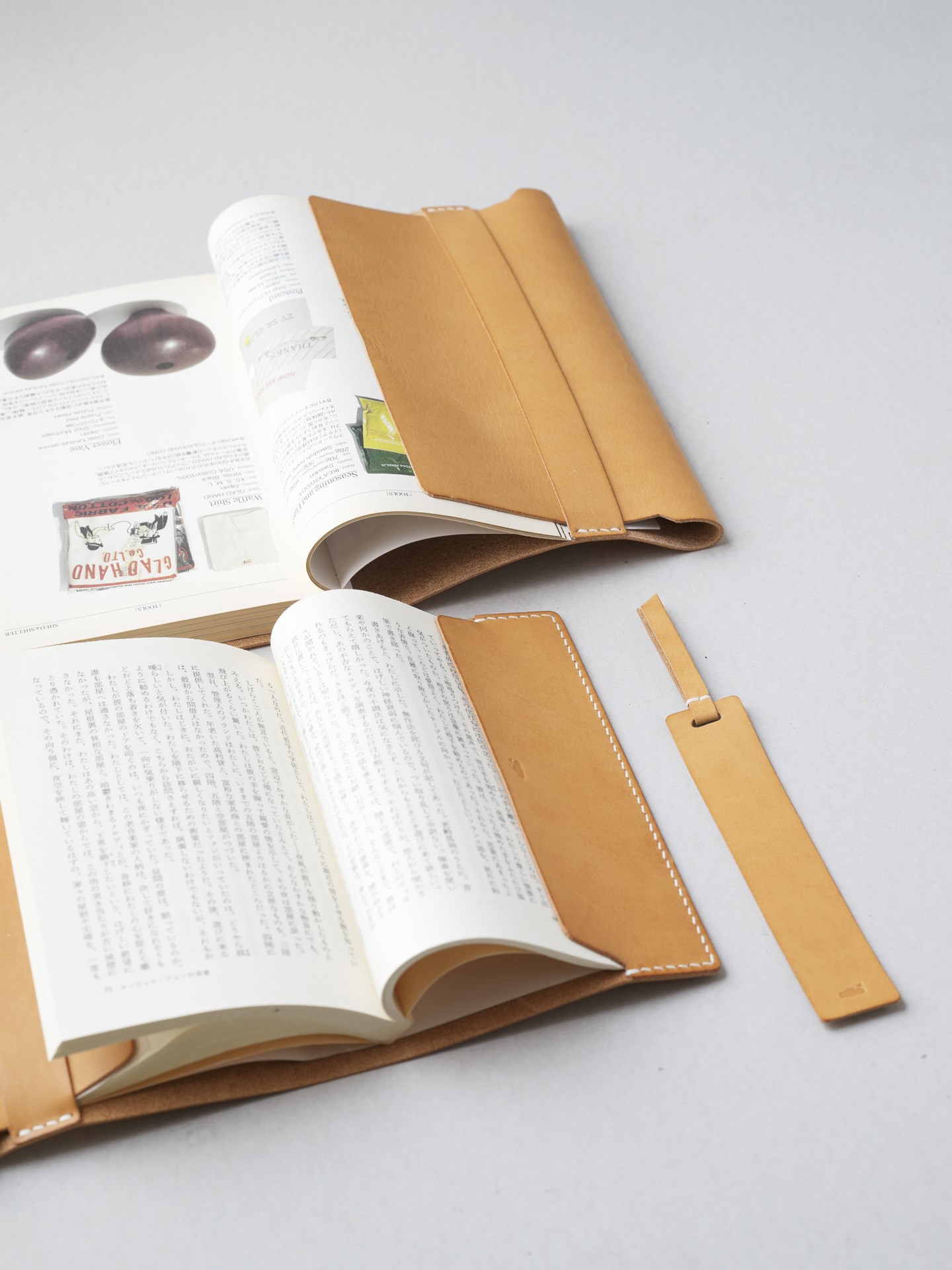 植物タンニン鞣し革に麻糸で手縫いを施したシンプルなつくりです。差込部にステッチを入れることで、ブックカバー1型をよりスマートに、本を読みやすく進化させました。