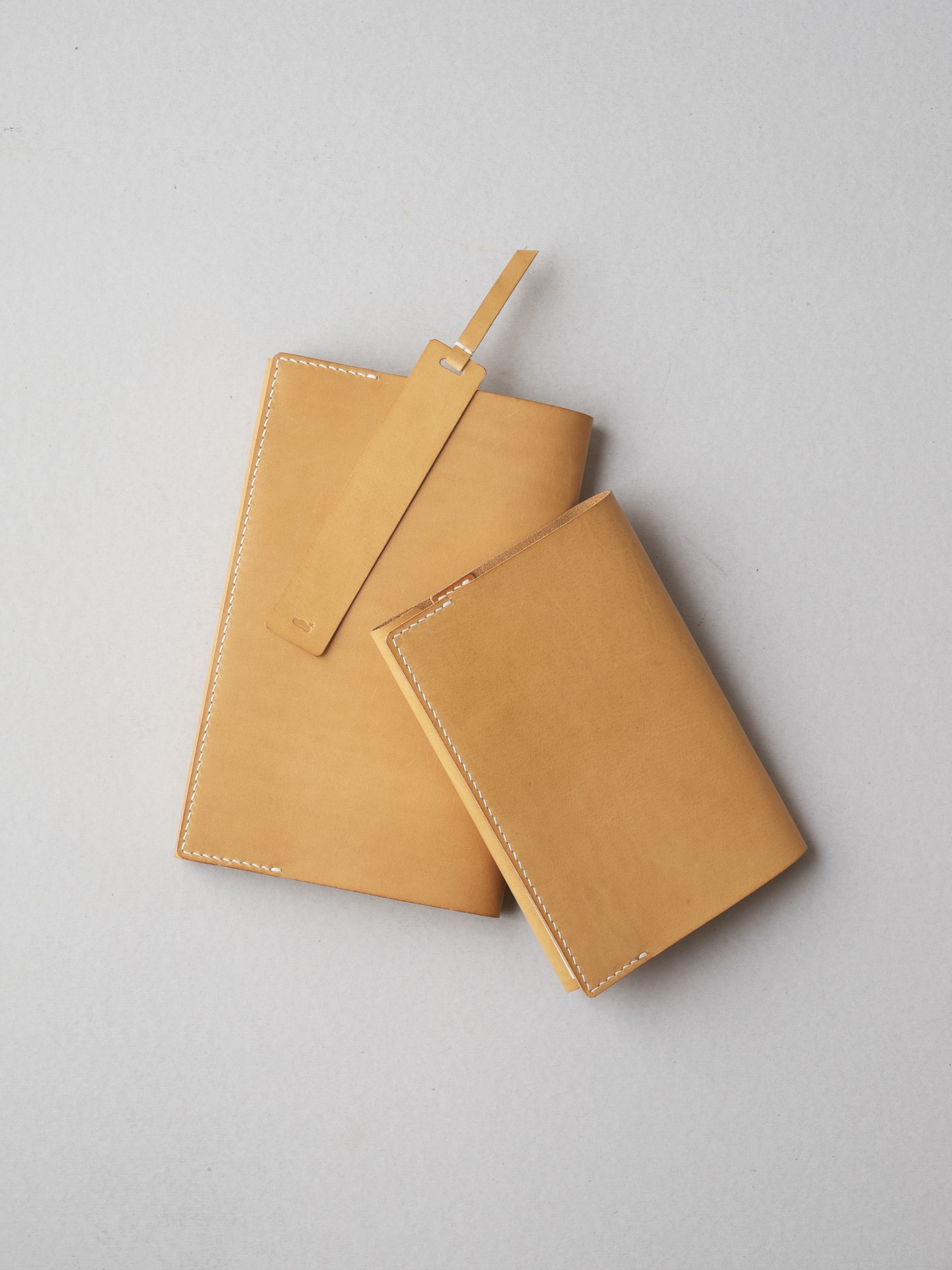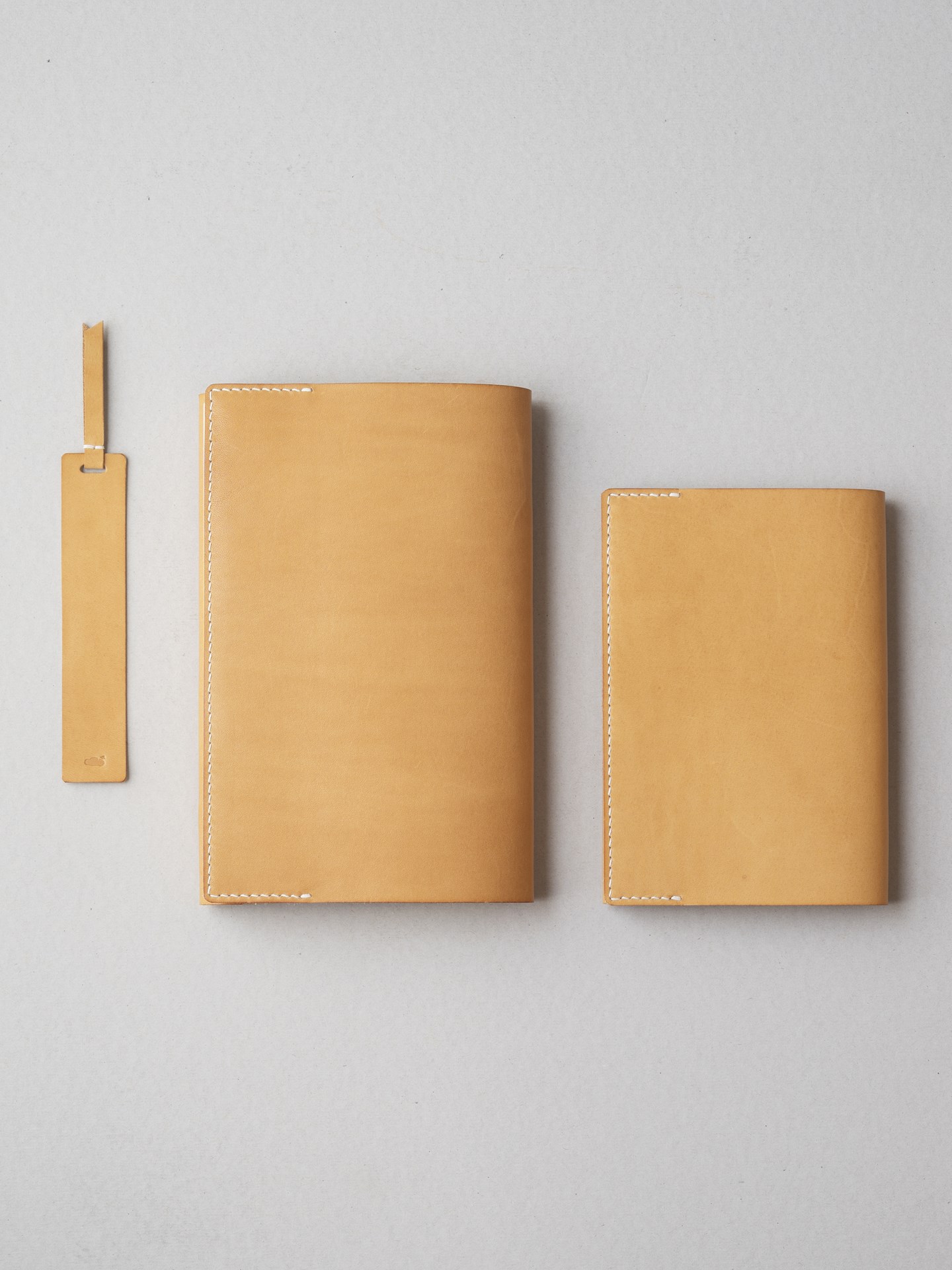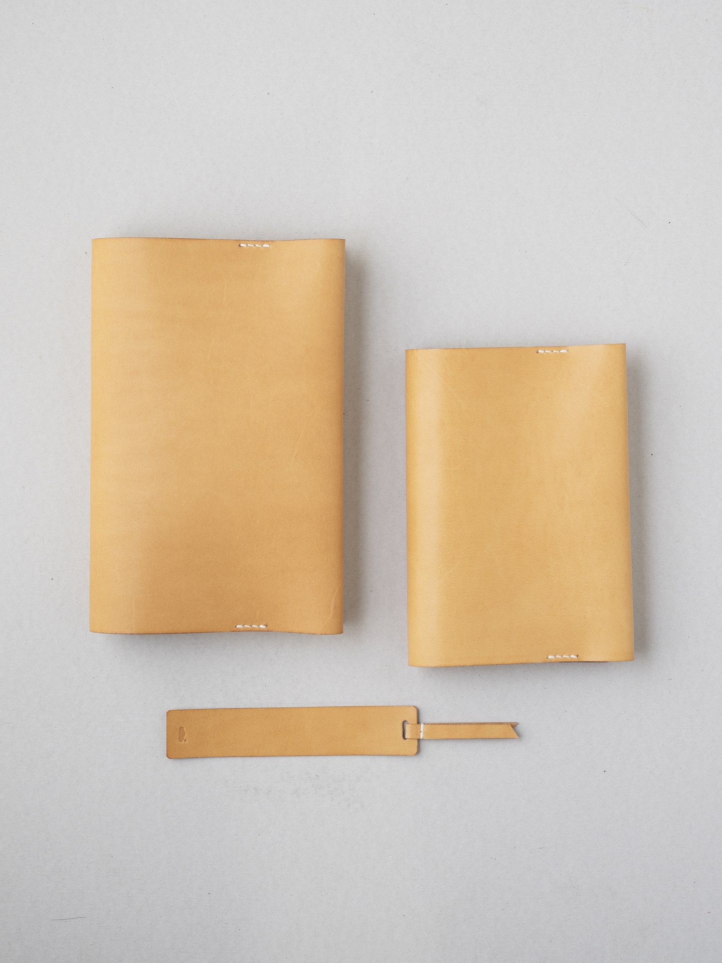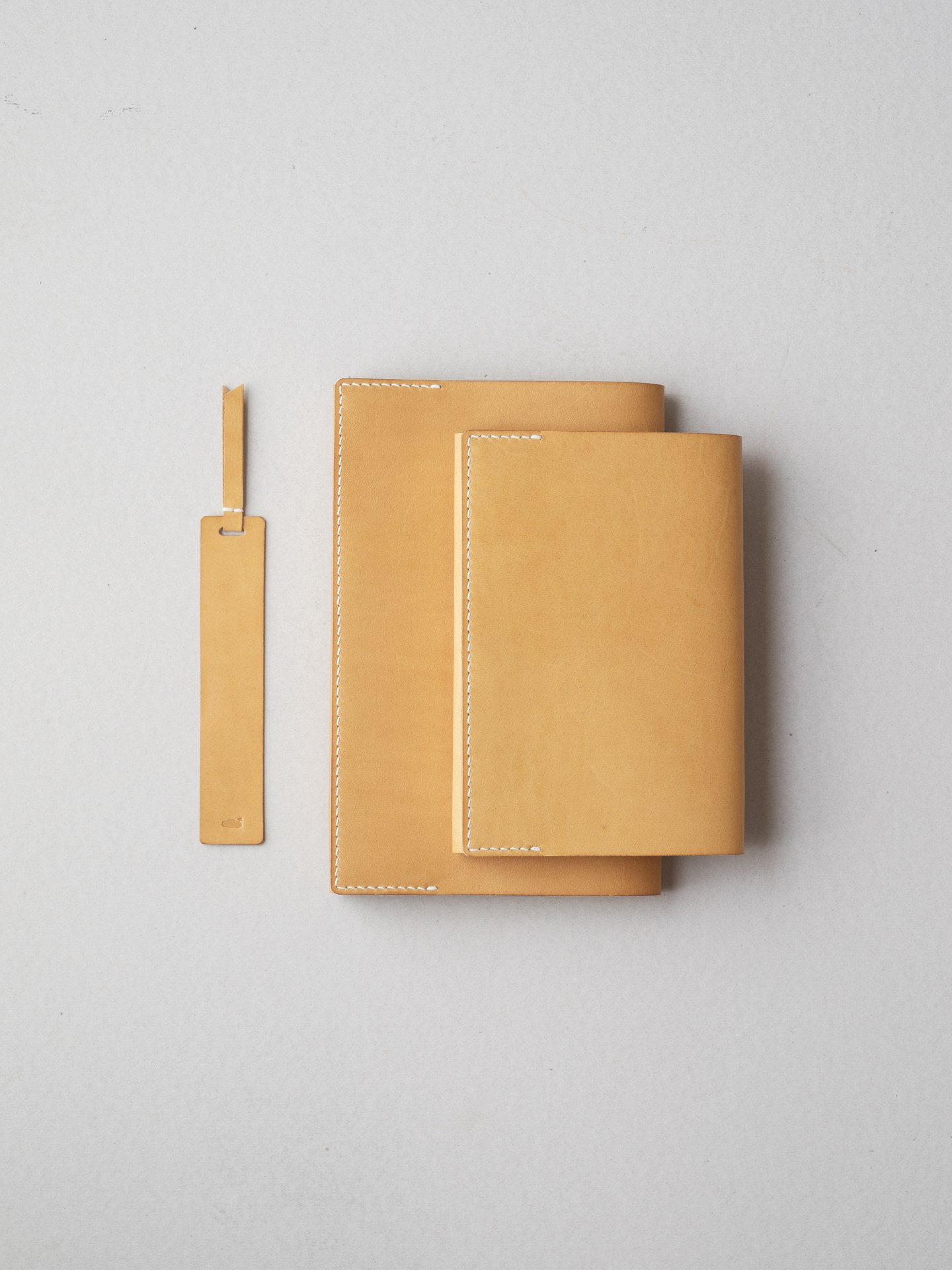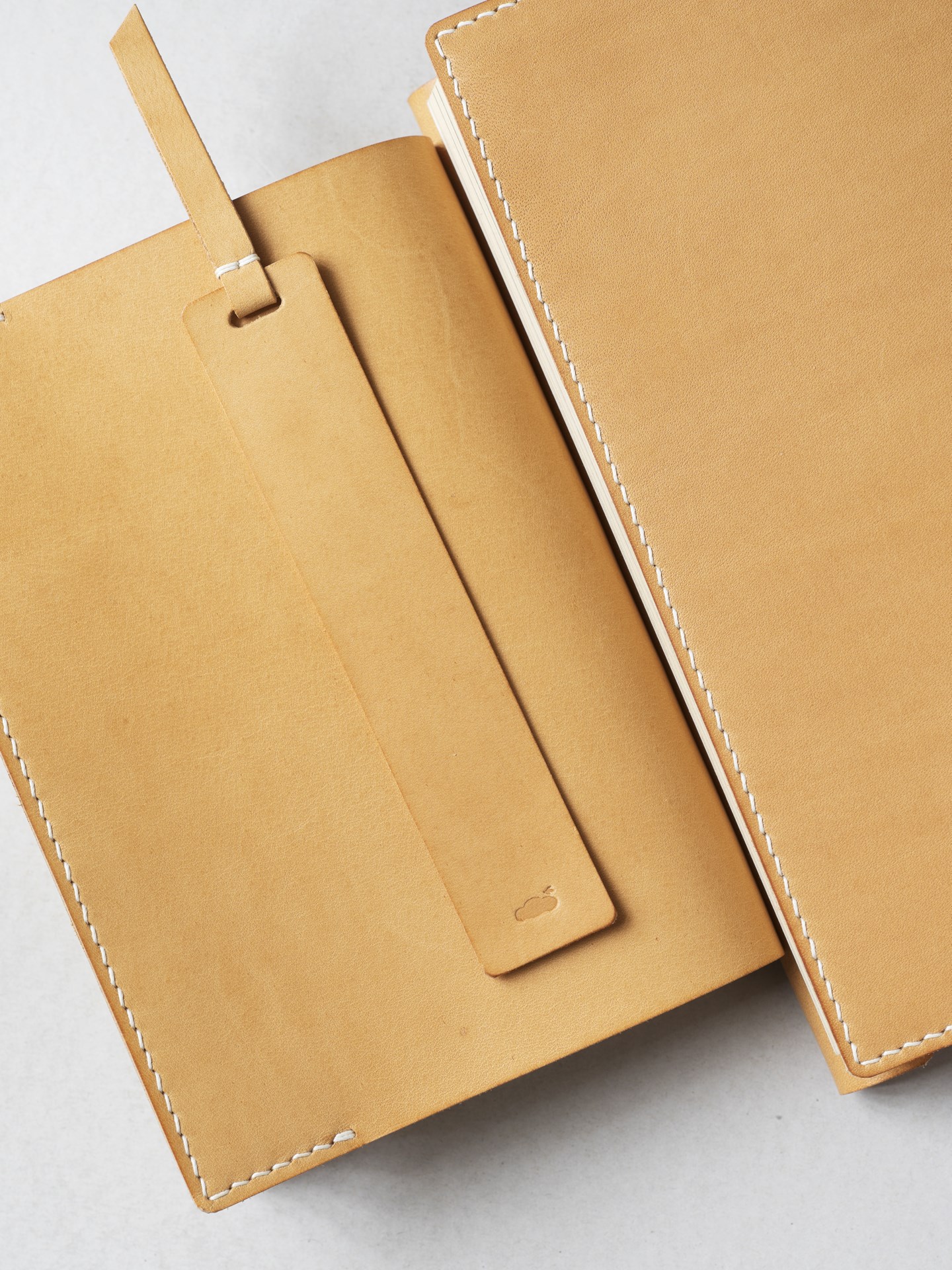 植物タンニン鞣し革に麻糸で手縫いを施したシンプルなつくりです。差込部にステッチを入れることで、ブックカバー1型をよりスマートに、本を読みやすく進化させました。