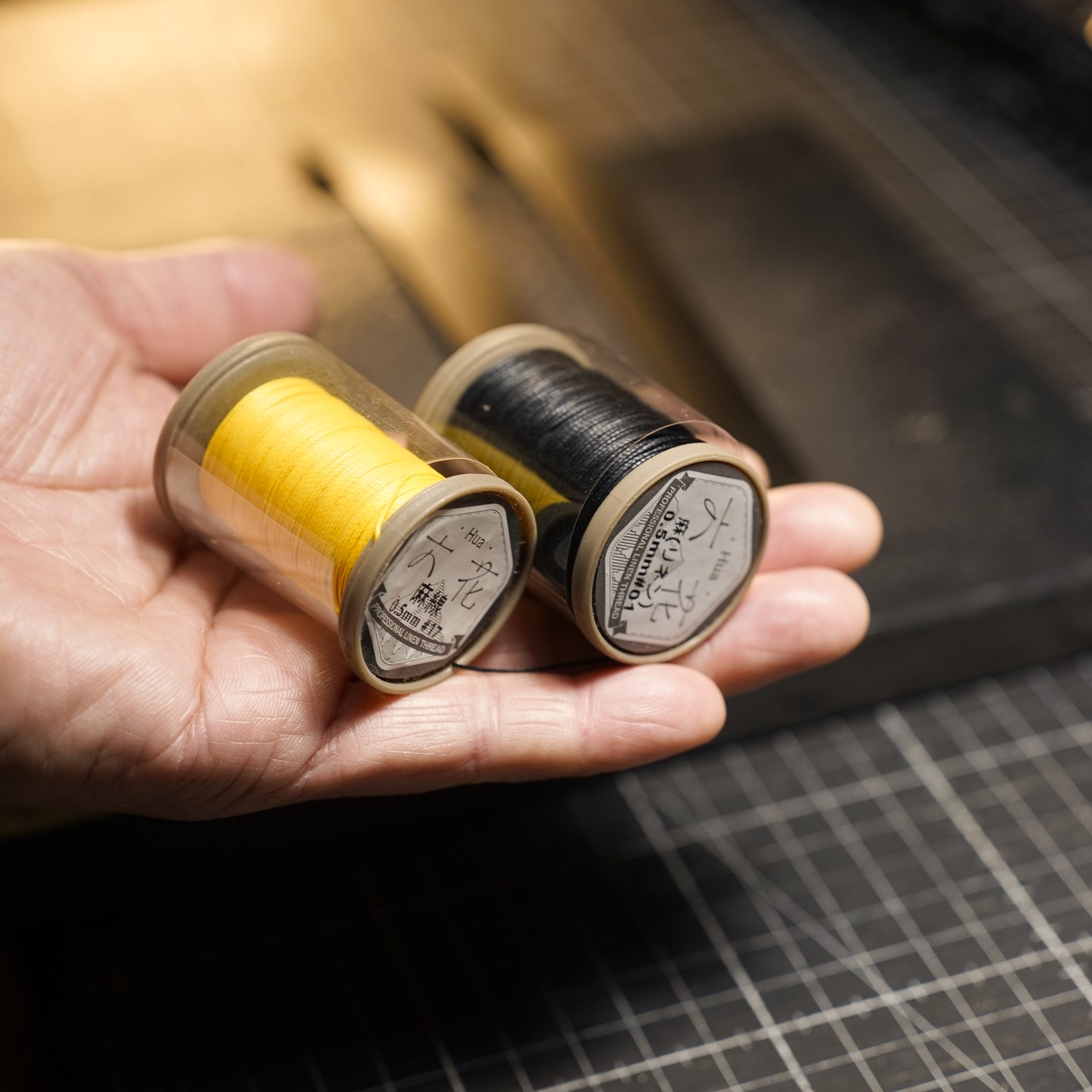 切出したイタリアンハードの黒革ベルトに六花リネン糸の17黄と01黒を使用して縫い付けます。